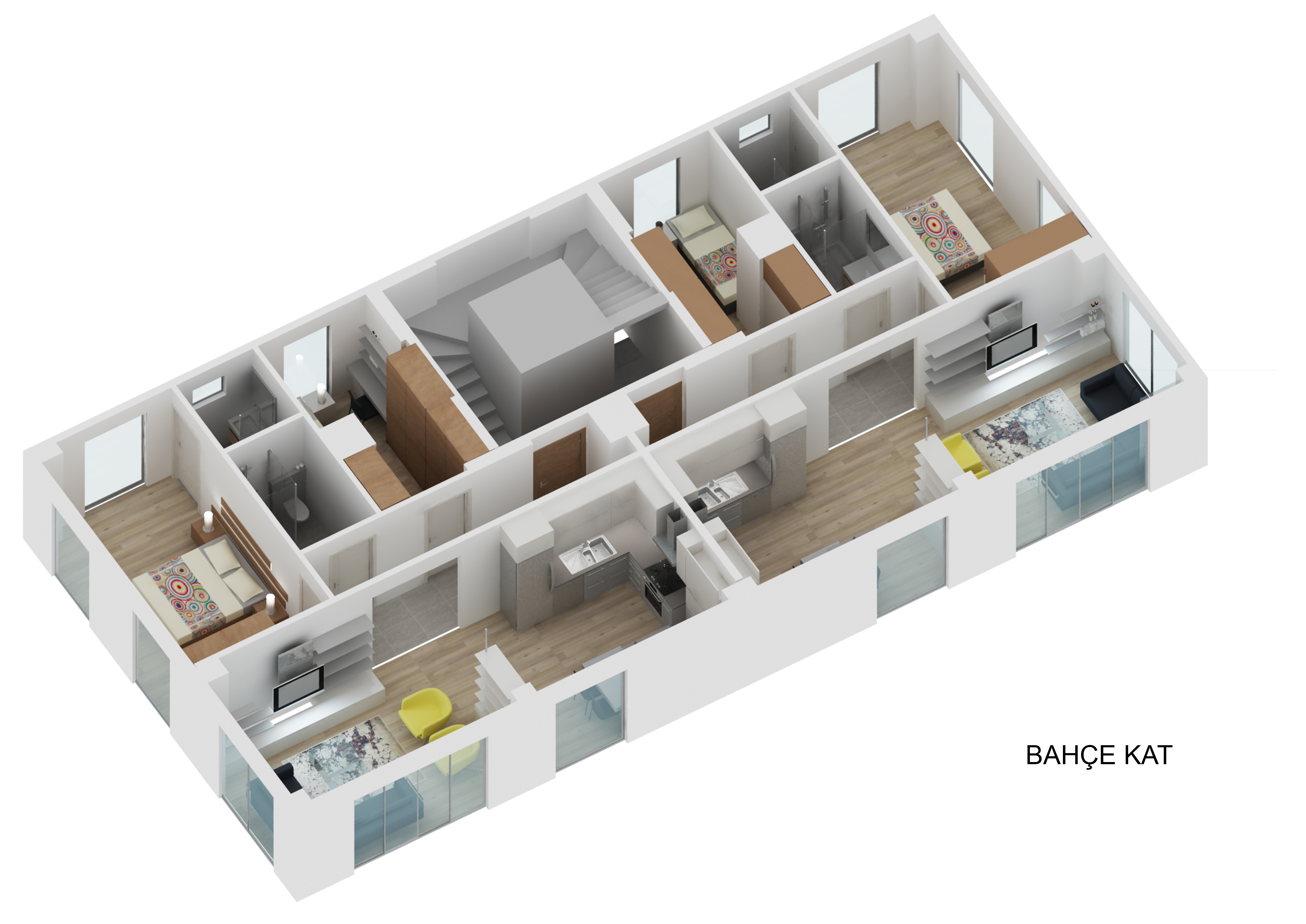 1. Bodrum kat bahçe katı niteliğinde 2 adet 90 m² açık mutfaklı 2+1 daire olarak tasarlandı.