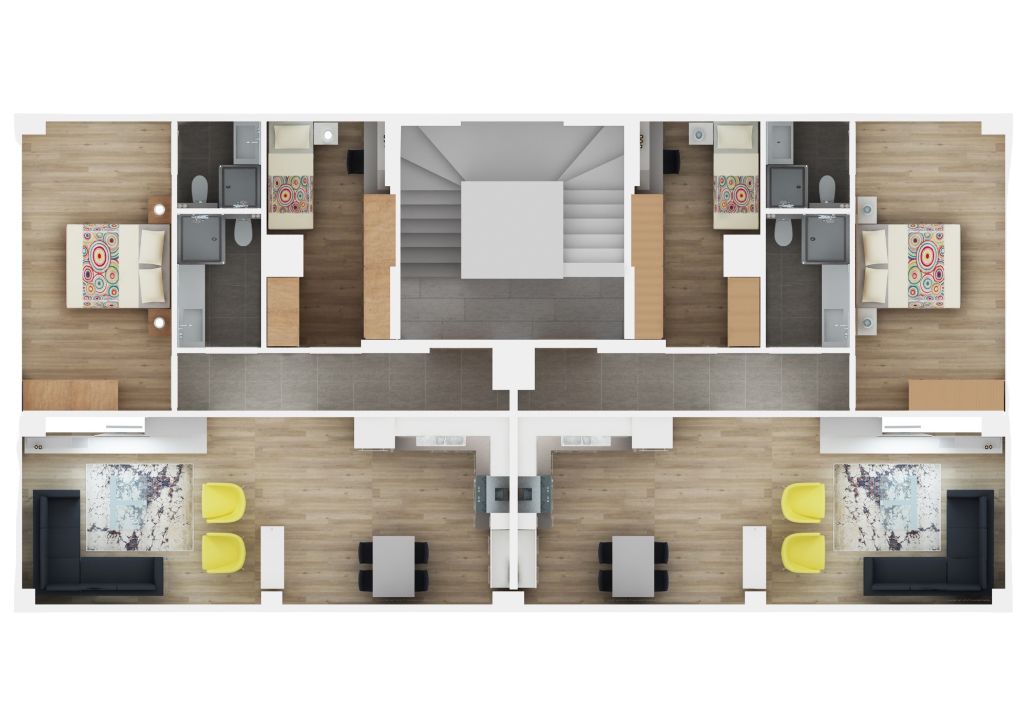 1. ve 3. Normal katlarda 3’er daire tasarlandı. Köşe daireler 105 m² ebeveyn banyolu 2+1 daireler olup, ara daireler 65 m² açık mutfaklı 2+1 dairelerdir.