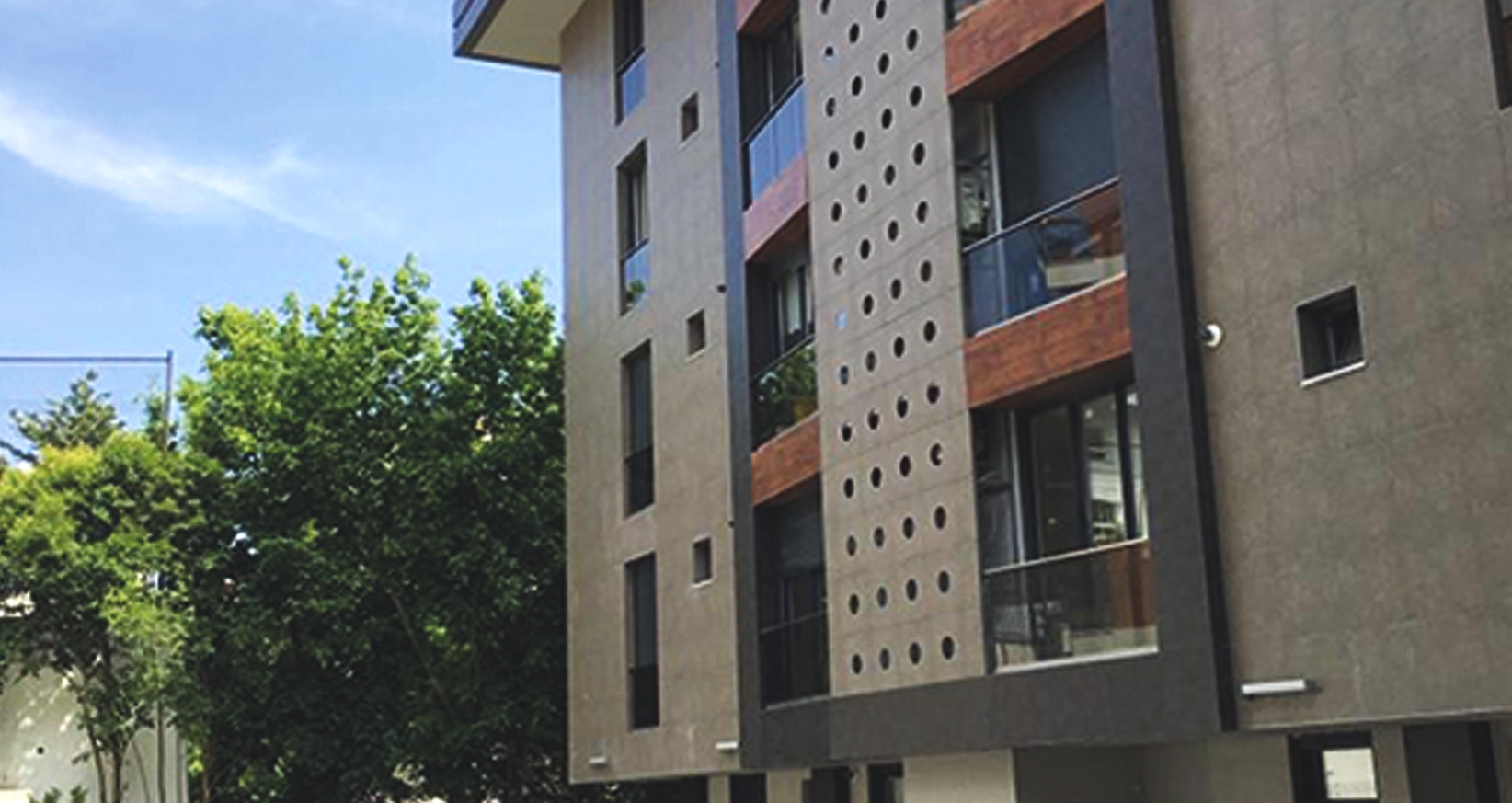 Bina giriş cephesinde ağırlıklı olarak açık toprak rengi cephe seramiği ve özel detaylar kullanılmıştır.