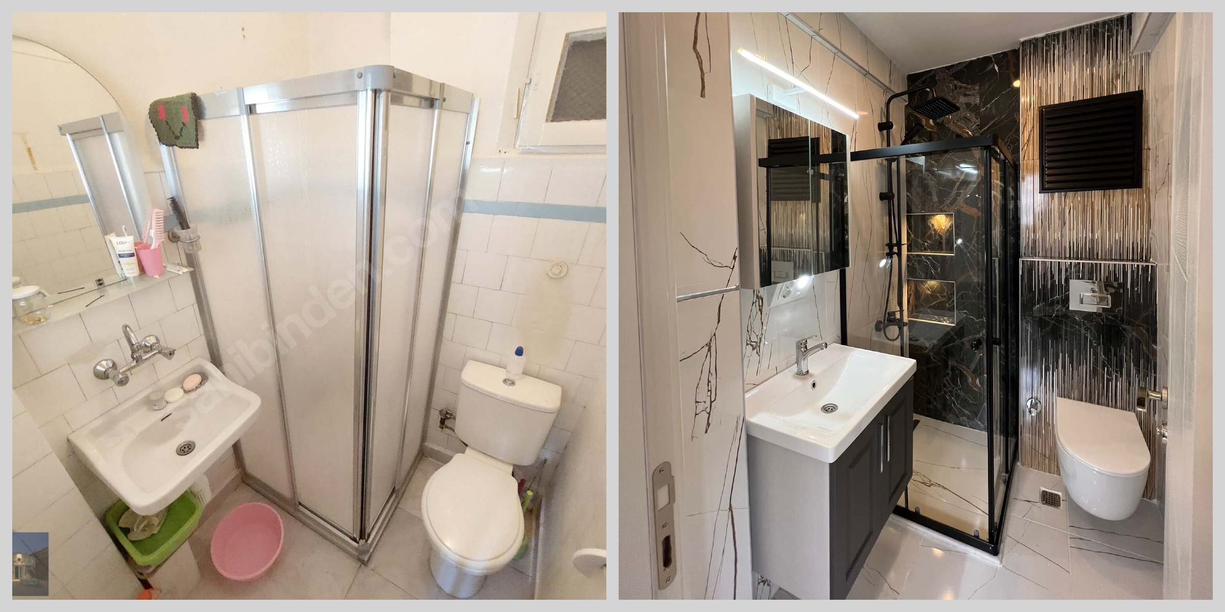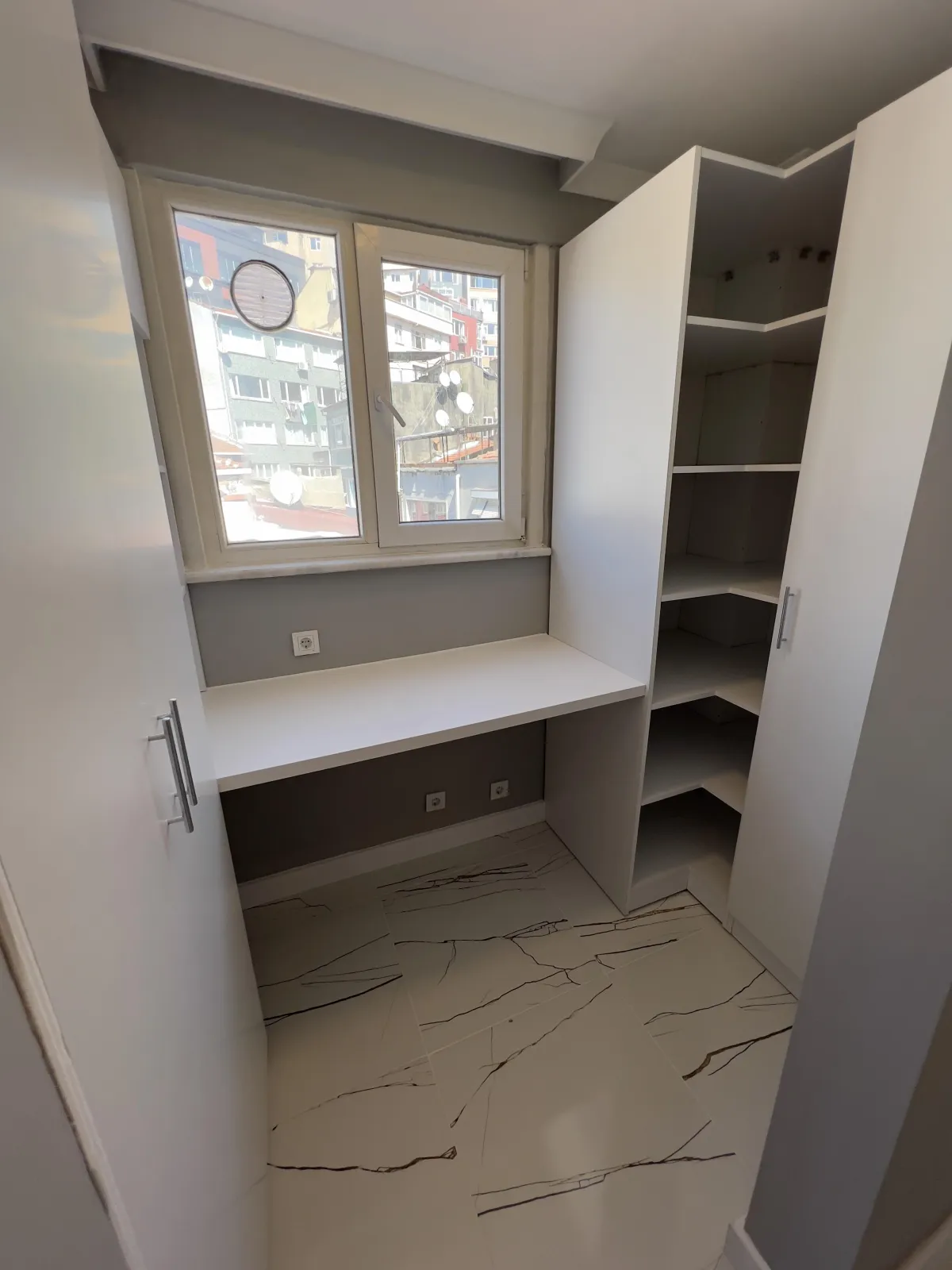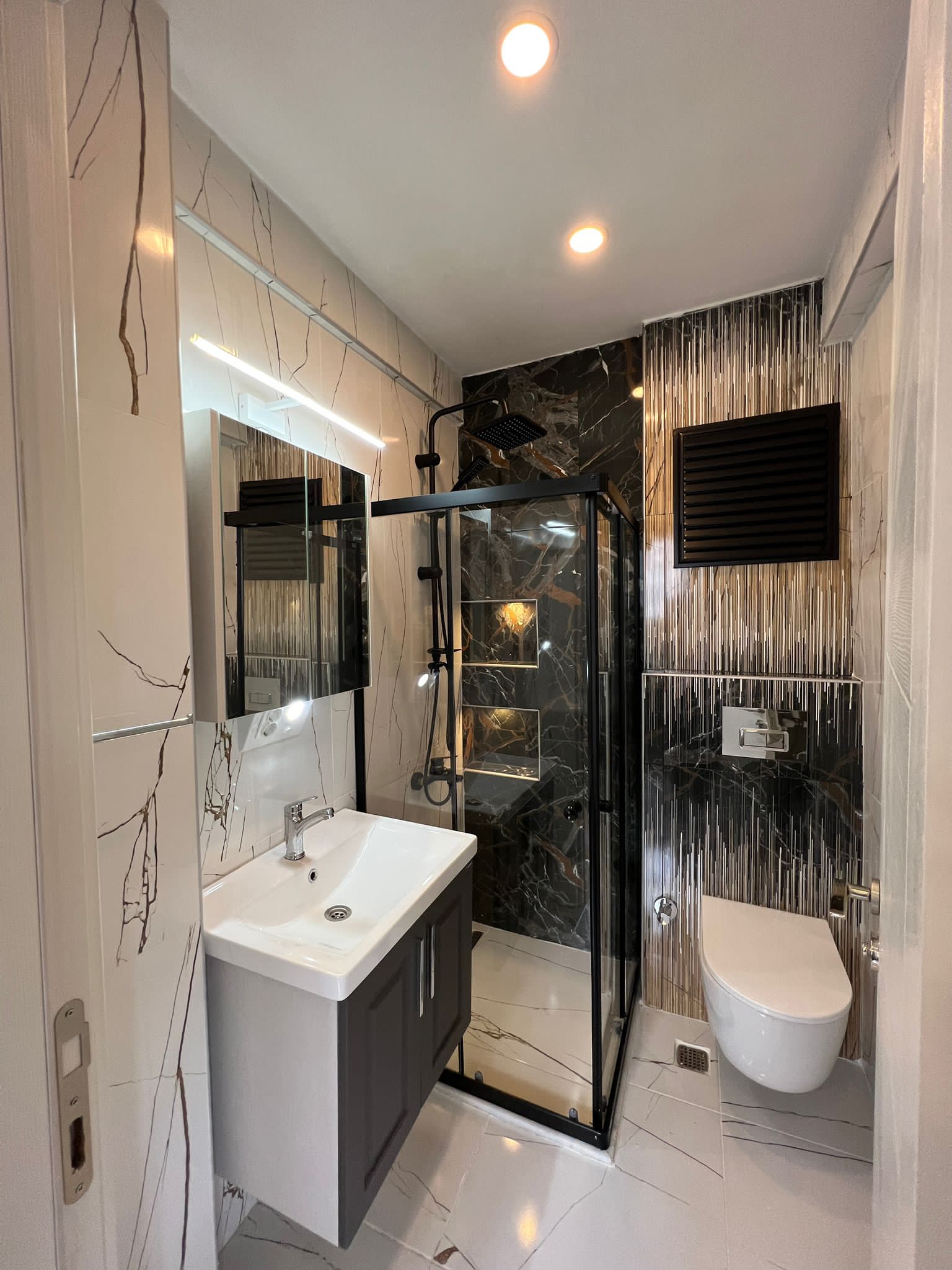 dolaplı bir çamaşır odası olarak tasarlandı. Banyoda led aydınlatma detaylı nişler ve son moda