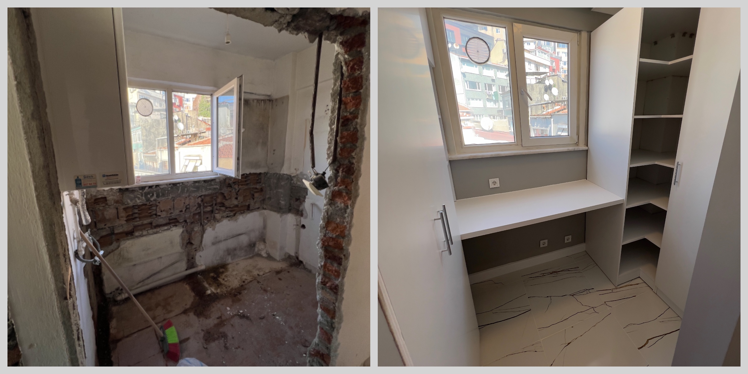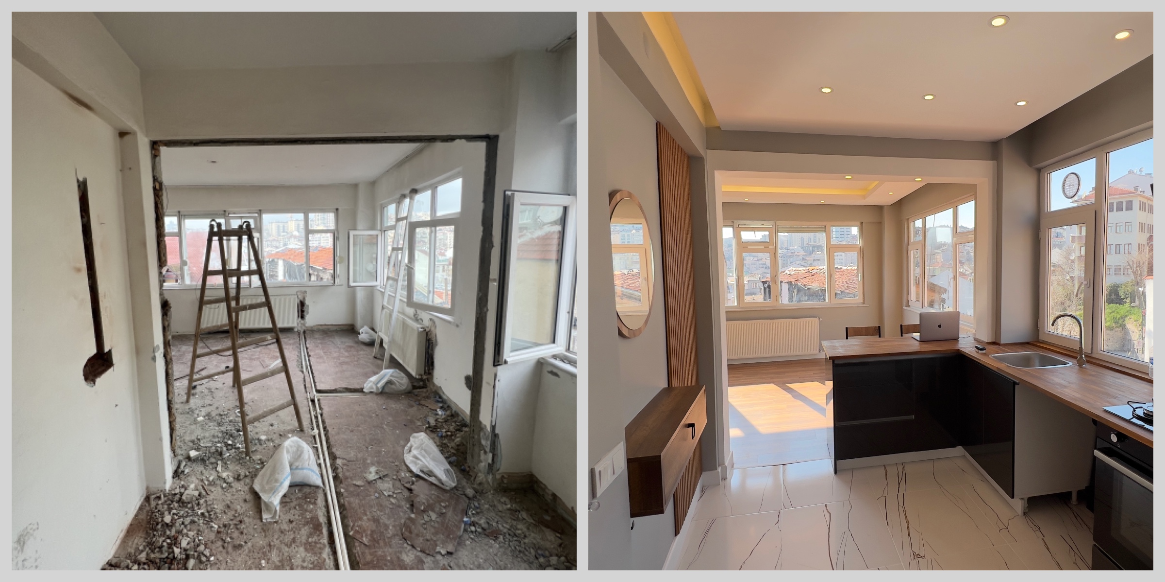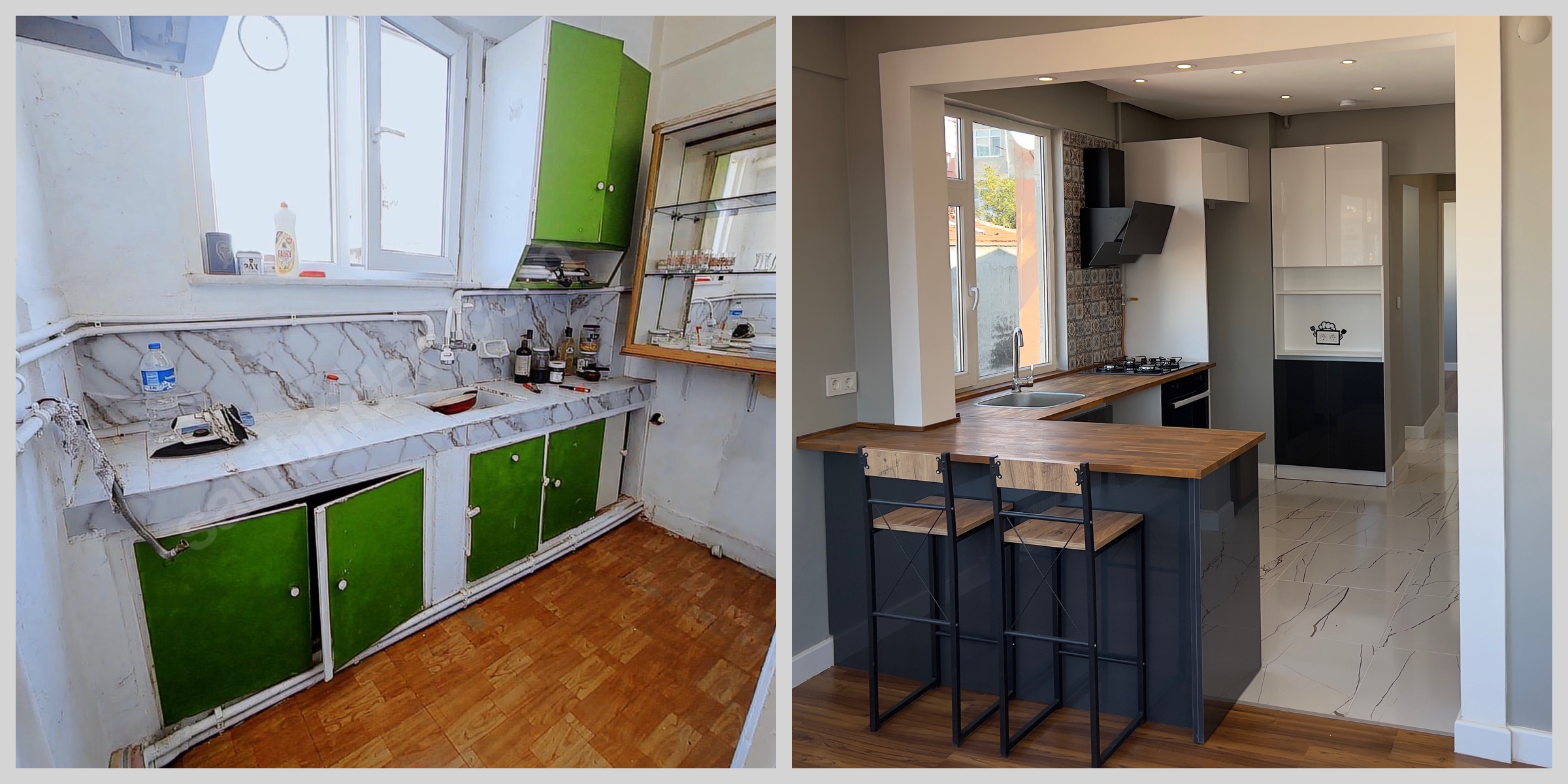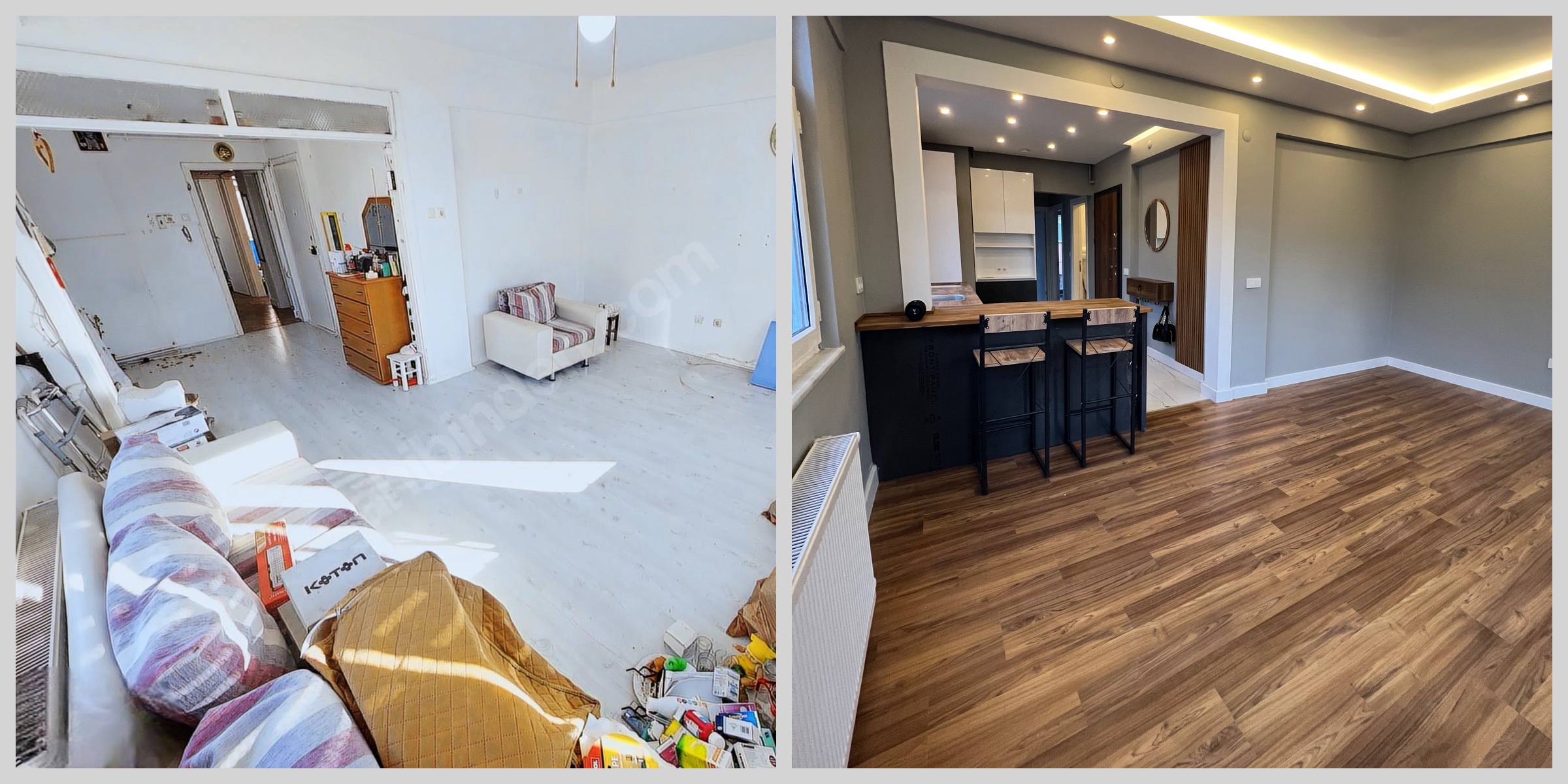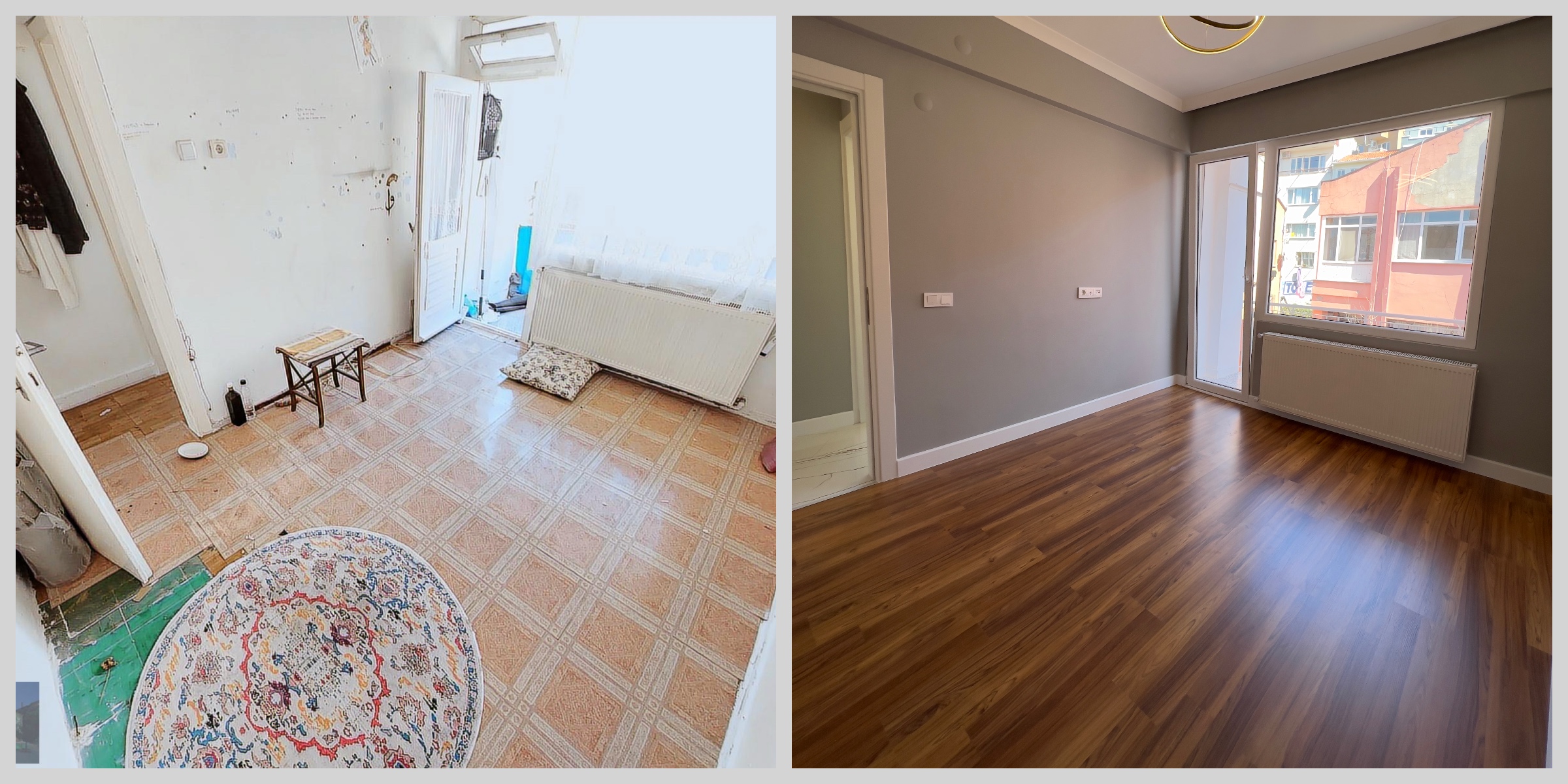 50 yıllık, bakımsız, duvarları ve döşemeleri yamalı eski daire, küçük dokunuşlarla