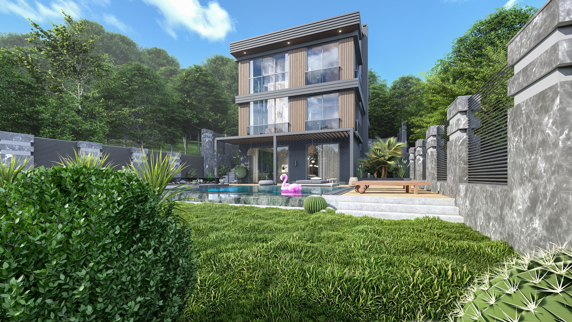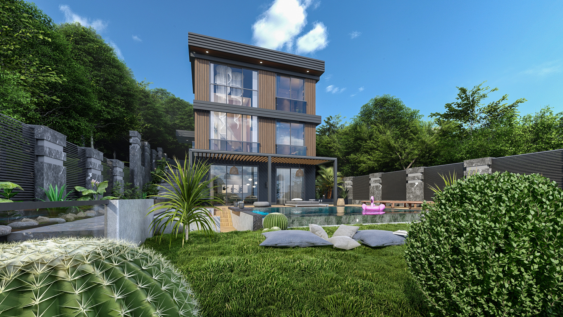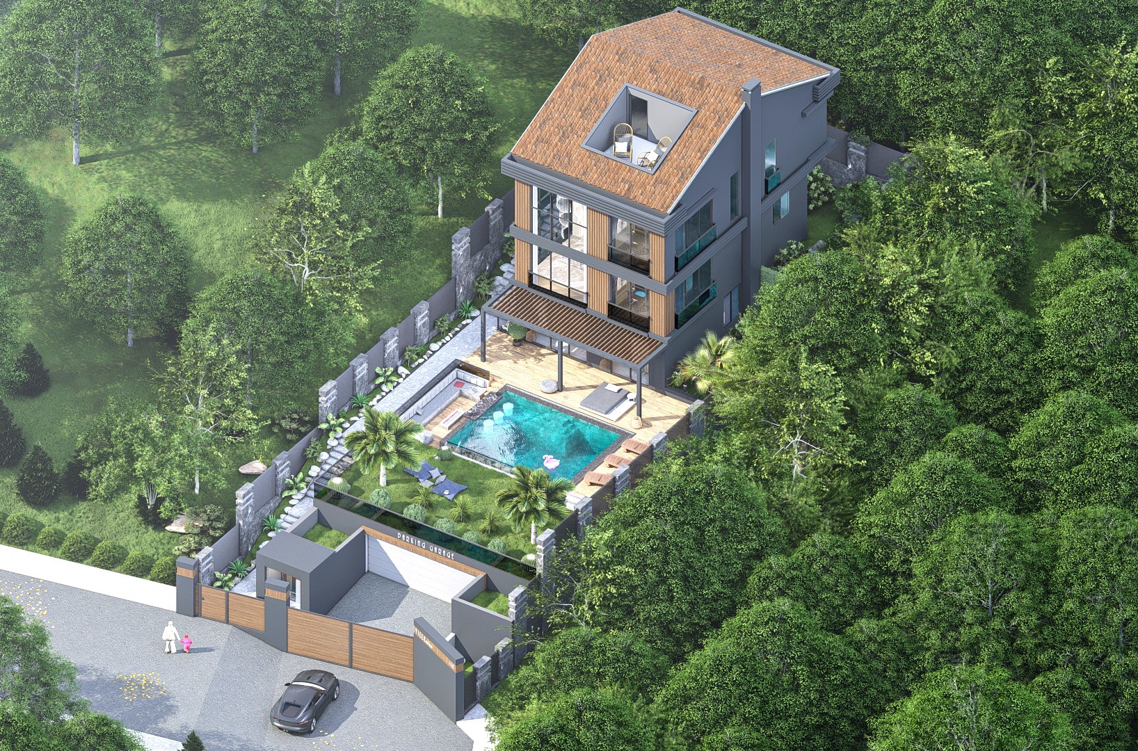 395 m² çatı piyesi olan 3 katlı 7+2 villa, 27 m² yüzme havuzu ve 42 m² set altı otopark tasarlanmıştır.