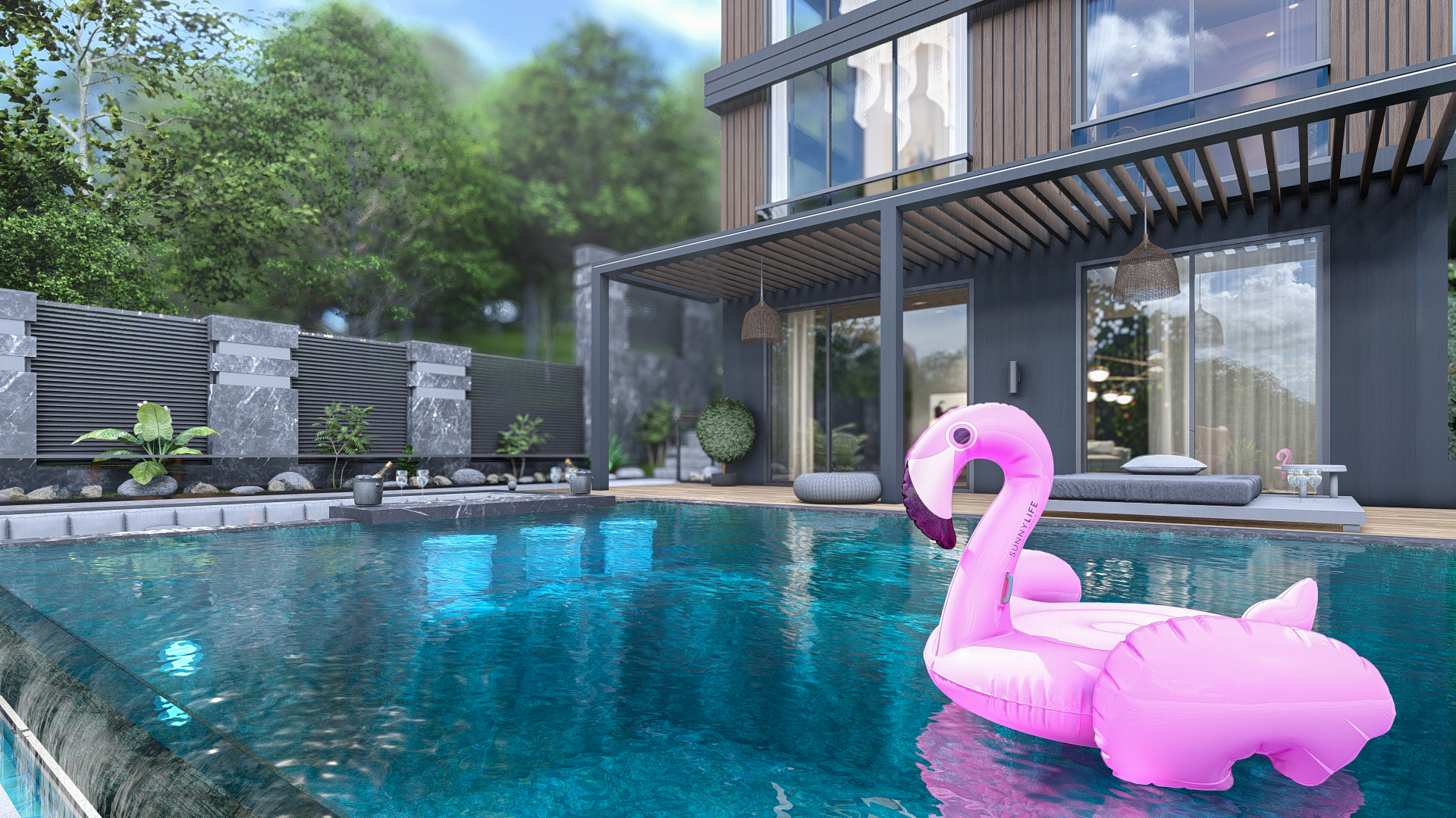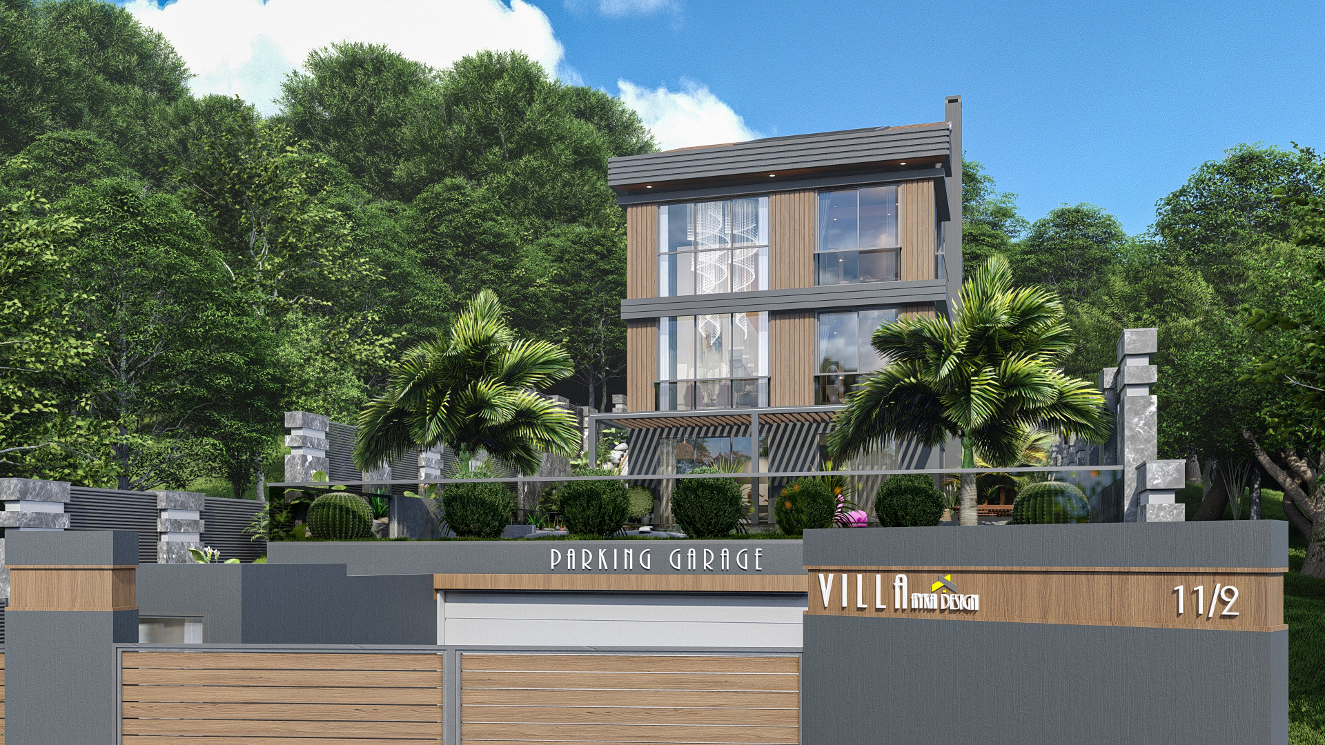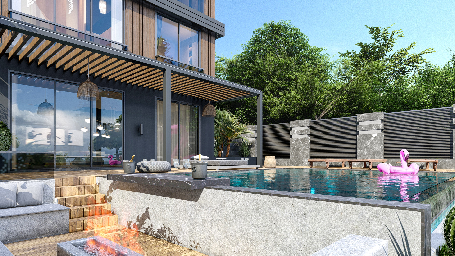 395 m² çatı piyesi olan 3 katlı 7+2 villa, 27 m² yüzme havuzu ve 42 m² set altı otopark tasarlanmıştır.