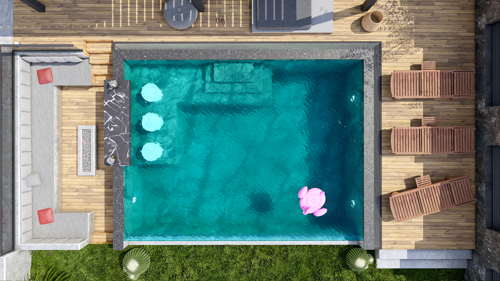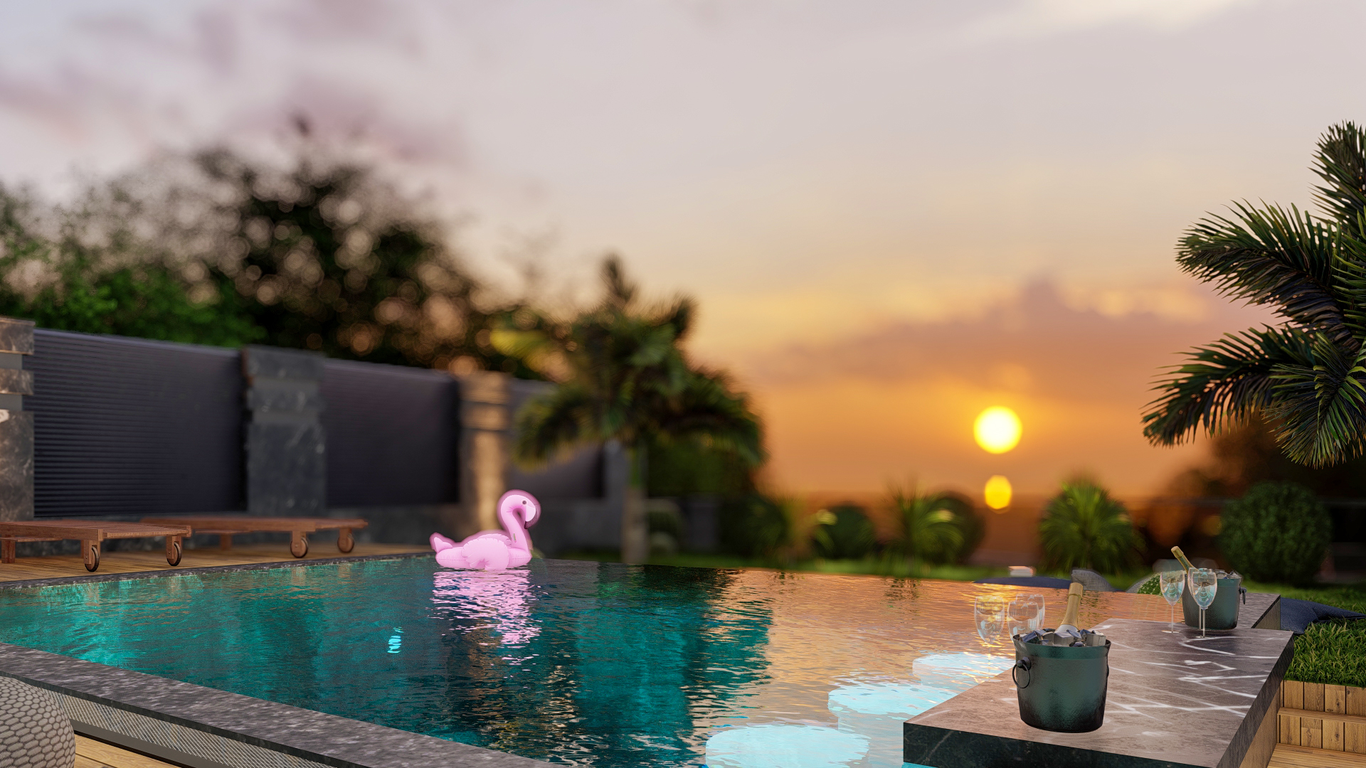 Set altı otoparkın üstü, havuzun önünde, daha alt kotta, havuza sonsuzluk havuzu hissi veren geniş bir bahçe olarak düzenlendi.