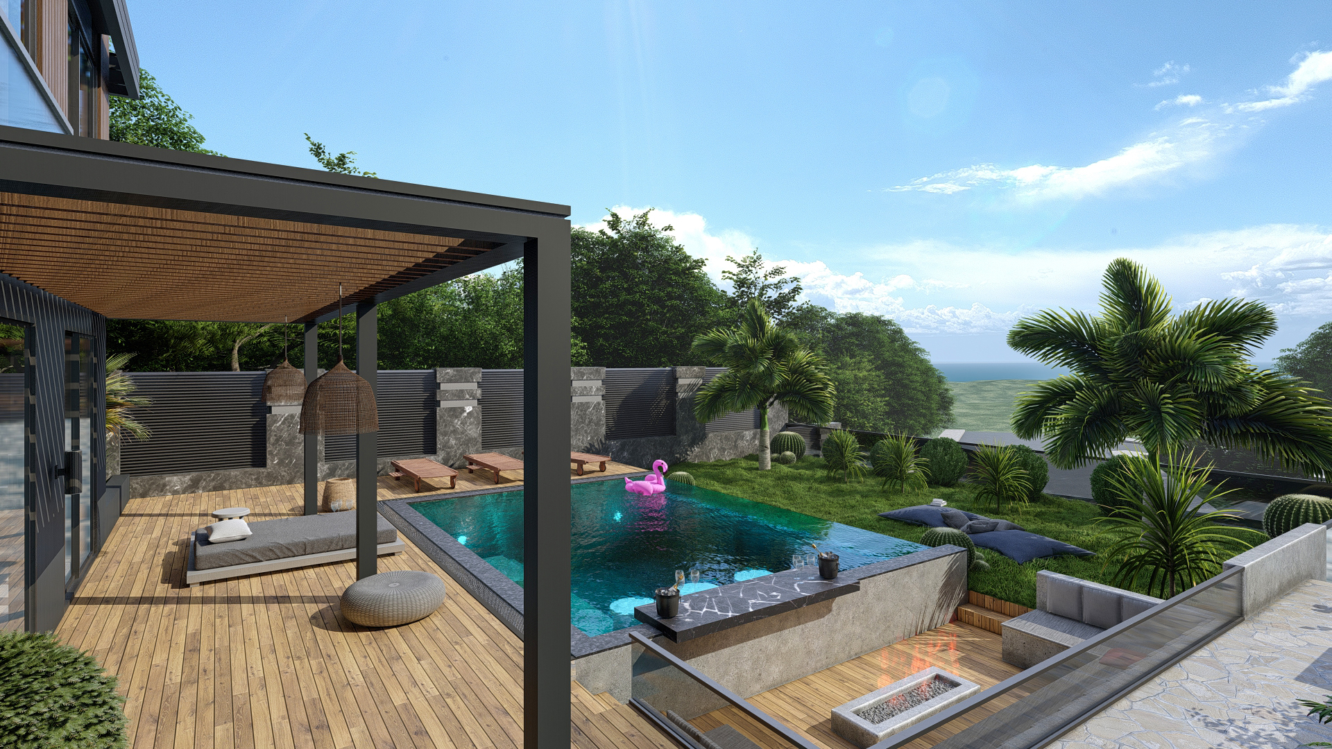 Terasın önünde yüzme havuzu ve ateş çukuru olan bir oturma alanı planlandı.