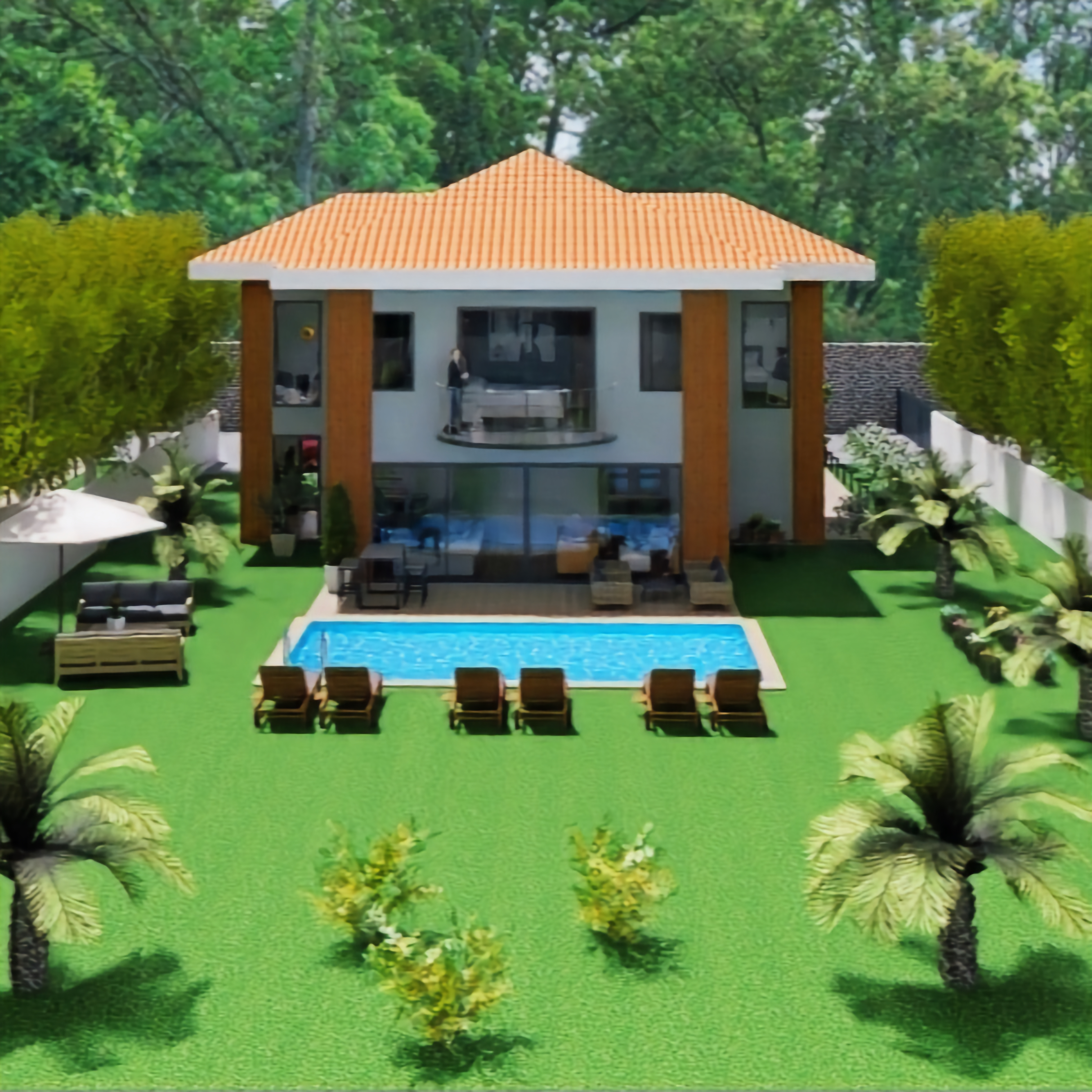 Havuz ve geniş bahçeye bakan cephede yarım daire şeklinde geniş balkonu,