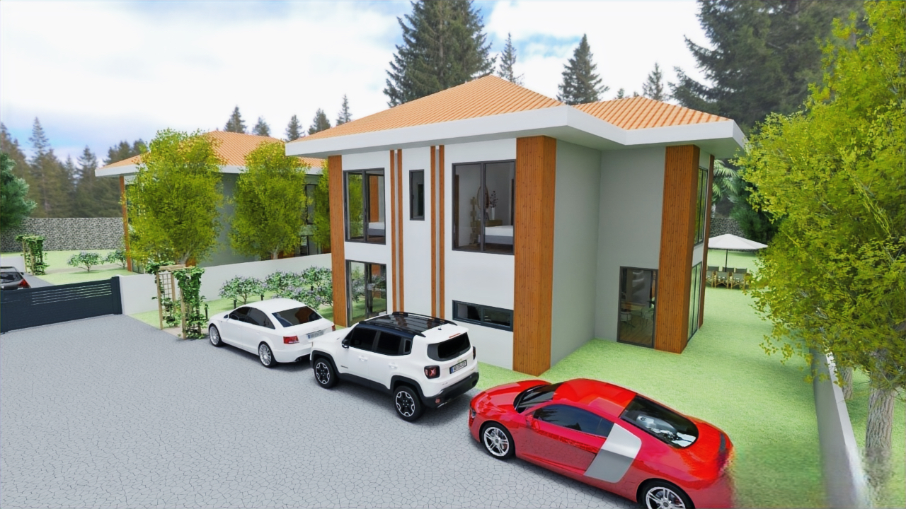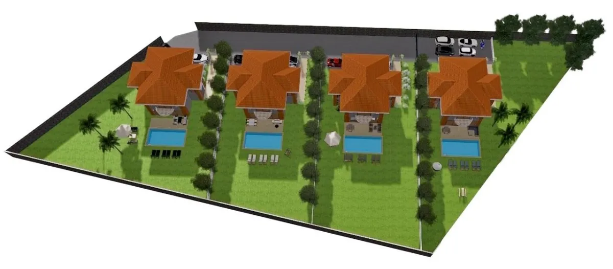 Parselin şekli ve bölgede şekillenen tipolojiye uyum sağlamak açısından 4 villalık bir site projesine karar verildi.