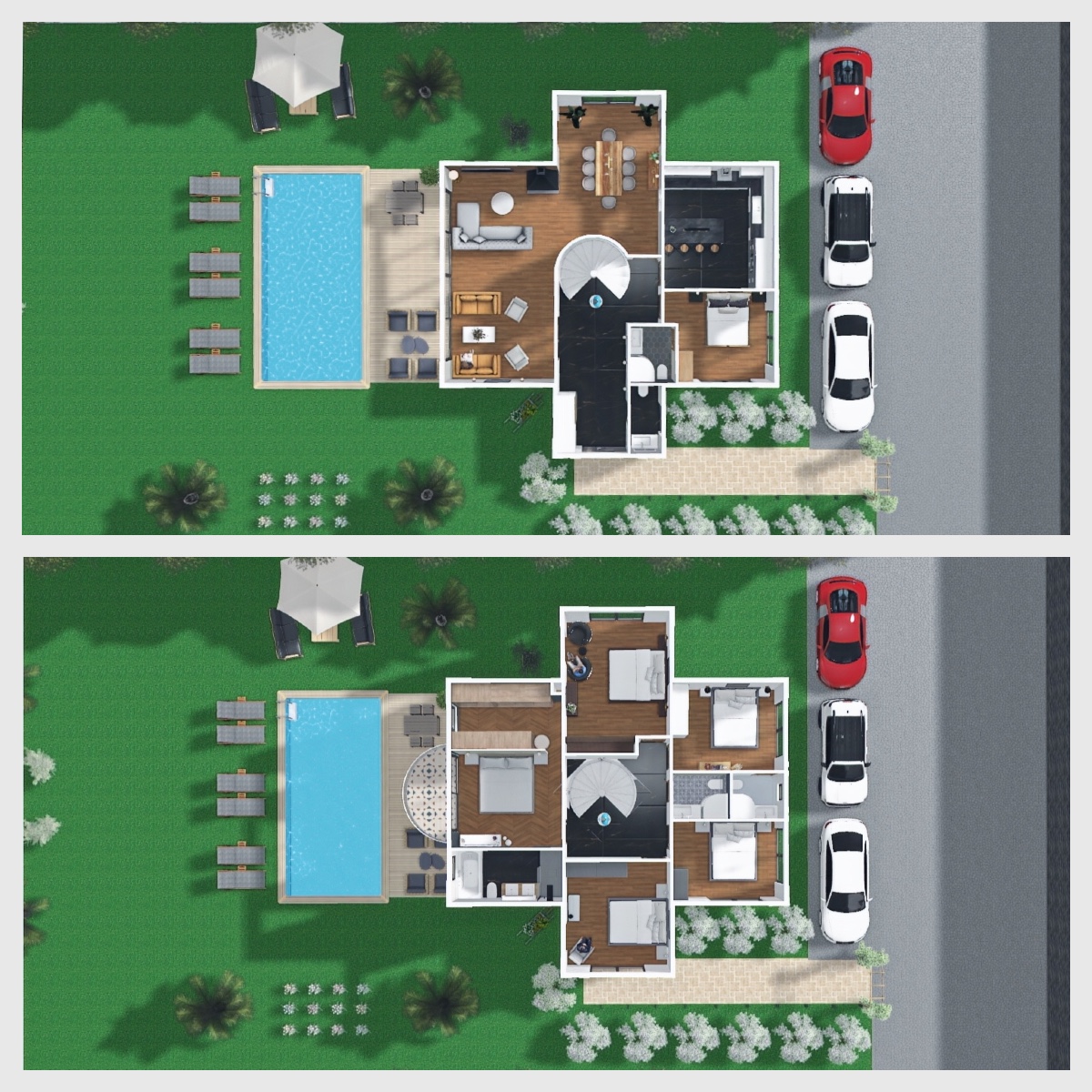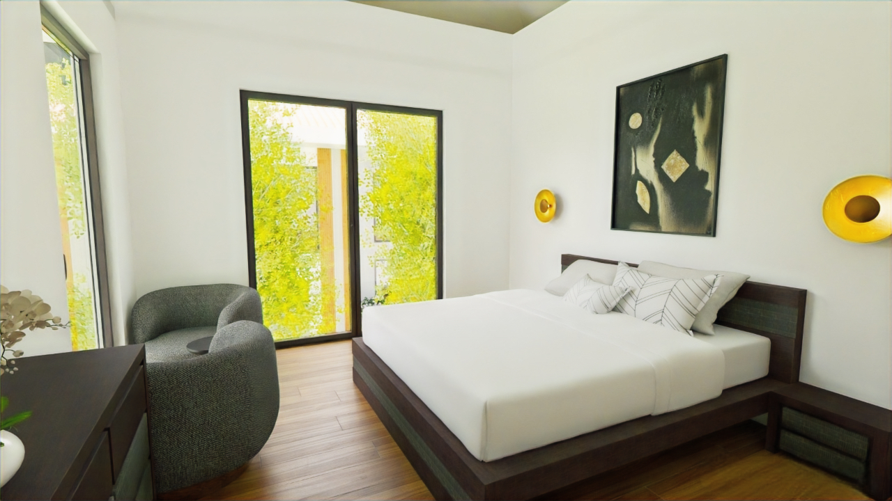 24 m² terasları ve 32 m² havuzları haricinde en küçük parsel alanına sahip villanın 620 m² bahçe kullanımı vardır.