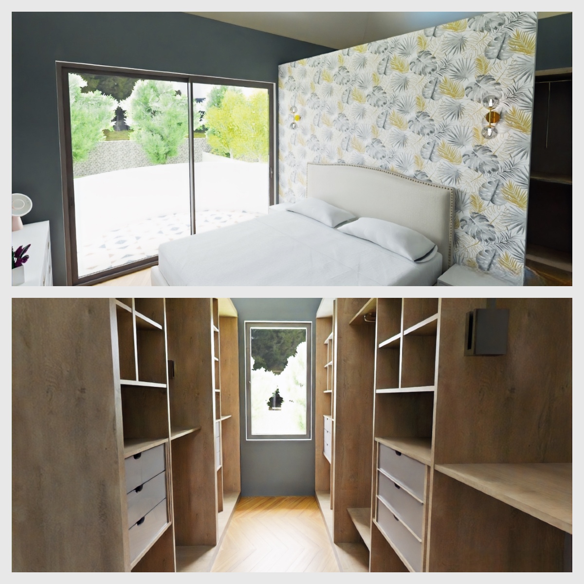 giyinme odaları ve jakuzili ebeveyn banyolarıyla master yatak odası suiti tasarlandı.